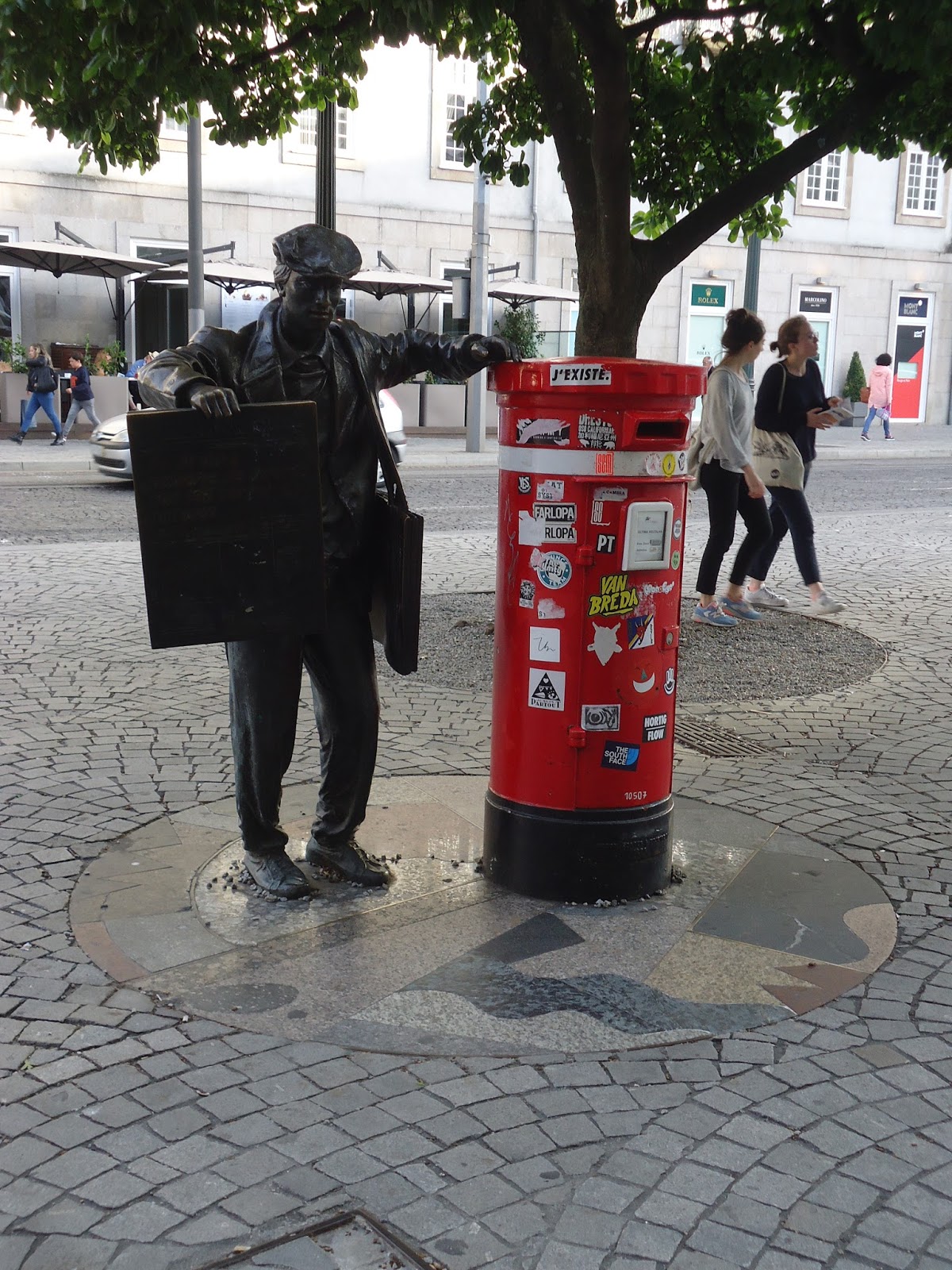 Mesmo ao pé da Estação de São Bento e do Mc Donald's (que é considerado um dos mais bonitos do Mundo) estava este marco dos CTT e esta estátua alusiva a como antigamente se sabiam as notícias.